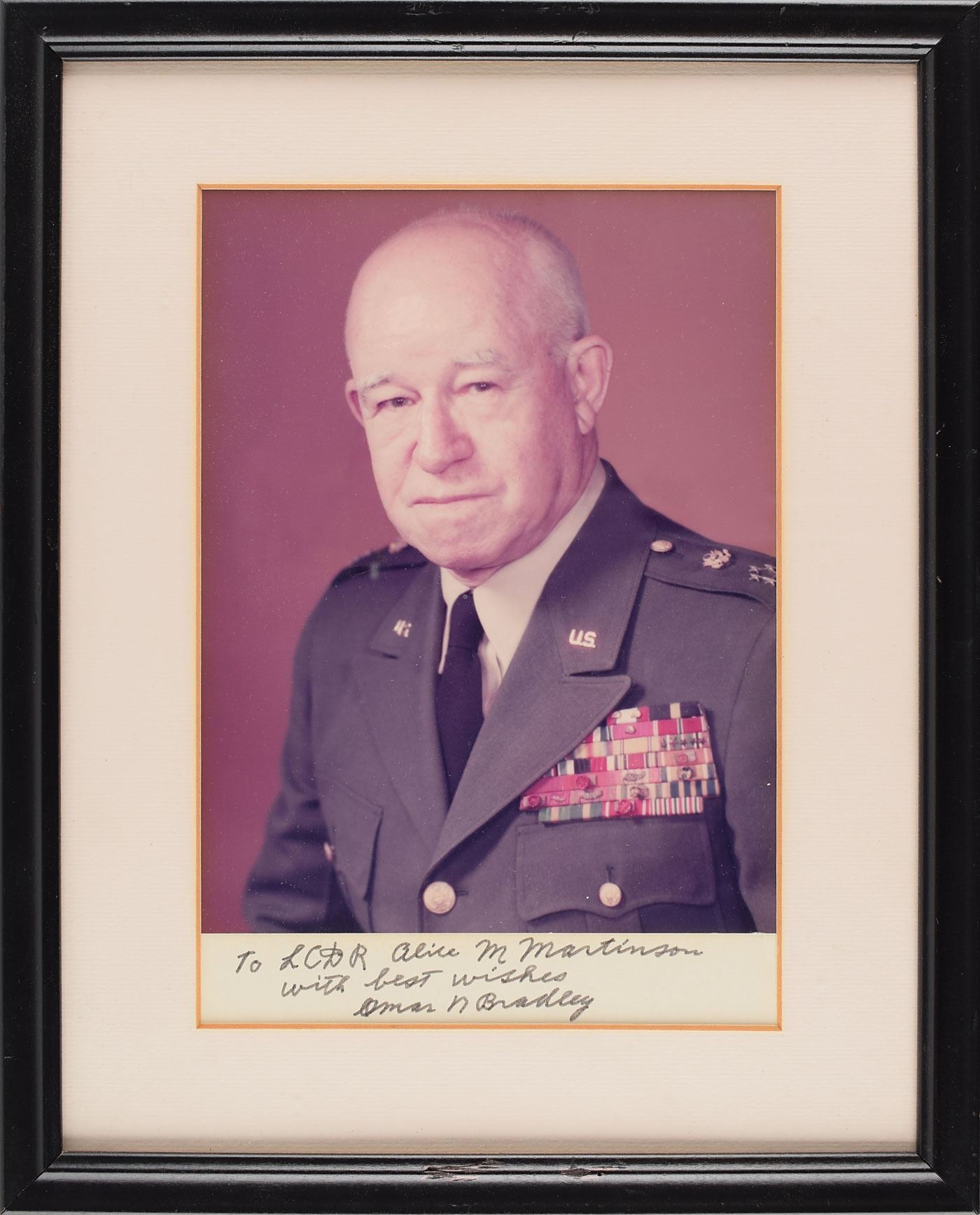 Color semi-glossy 7.25 x 9.25 photo of Bradley wearing his military uniform in a bust-length pose, signed and inscribed on the mount in black felt tip, "To LCDR Alice M. Martinson, with best wishes, Omar N. Bradley.” Matted and framed to an overall size of 12.25 x 15.25. In fine condition. Bradley remains particularly uncommon in signed color portraits.