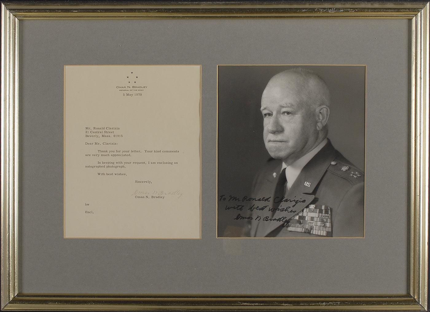 Matte-finish 7.25 x 8.5 photo of the five-star general in his dress uniform, signed and inscribed in black felt tip “To Mr. Ronald Clarizia, with best wishes, Omar N. Bradley.” Matted with a TLS from Bradley dated May 5, 1970, and framed to an overall size of 21.5 x 15.75. In fine condition.