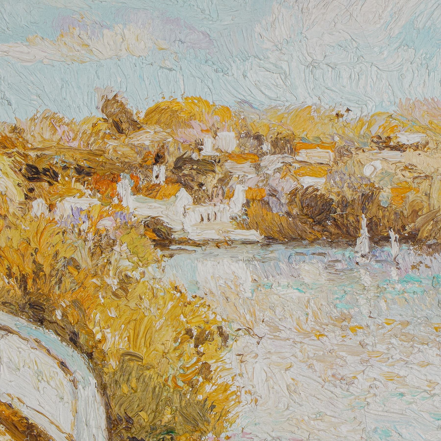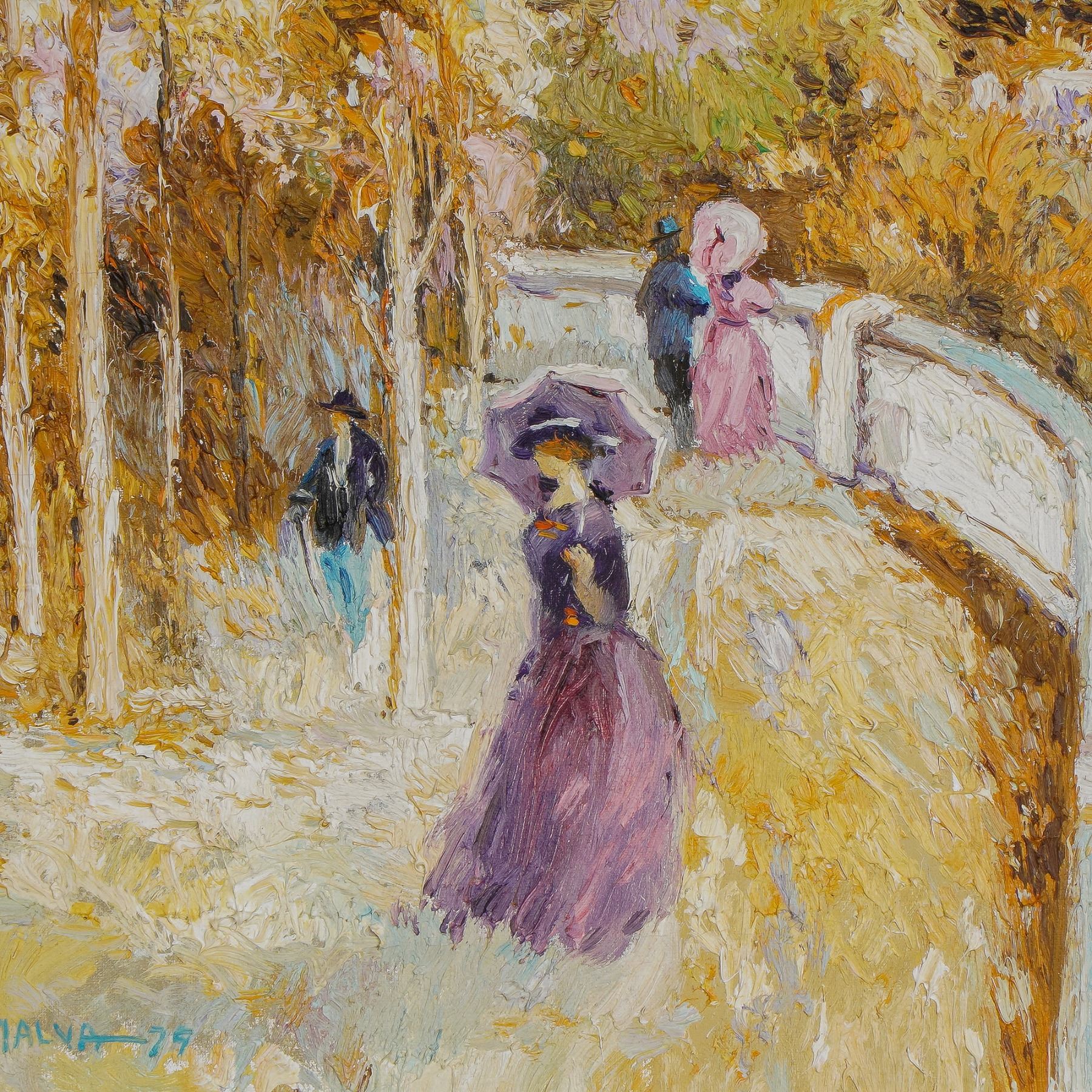 A radiant and romantic oil on canvas by Omar Hamdi, known professionally as Malva, depicting an elegant riverside promenade awash in the golden light of autumn. Painted in 1979, the work is rendered in Malva's signature impasto technique, with rich, expressive brushstrokes that give the scene depth and movement. Figures in Victorian attire stroll along a curving path bordered by vibrant autumn foliage, while the tranquil river and distant village provide a serene backdrop. The interplay of warm yellows, soft purples, and luminous blues captures the charm and sophistication that define Malva's oeuvre. Omar Hamdi Malva was born in Syria in 1951 and later became a celebrated painter in Austria, achieving international acclaim for his dynamic compositions and vibrant palette. His work reflects a blend of Eastern heritage and Western artistic traditions, resulting in paintings that are at once culturally rich and universally appealing. Throughout his career, Malva exhibited widely across Europe, the Middle East, and North America, and his works are held in numerous public and private collections. Known for infusing impressionistic scenes with his distinctive energy and color sense, Malva remains a highly sought-after name in the contemporary art market. Presented in an ornate giltwood frame with a linen liner, this piece is both a visual delight and a testament to the artist's enduring appeal. Signature and date on lower right.