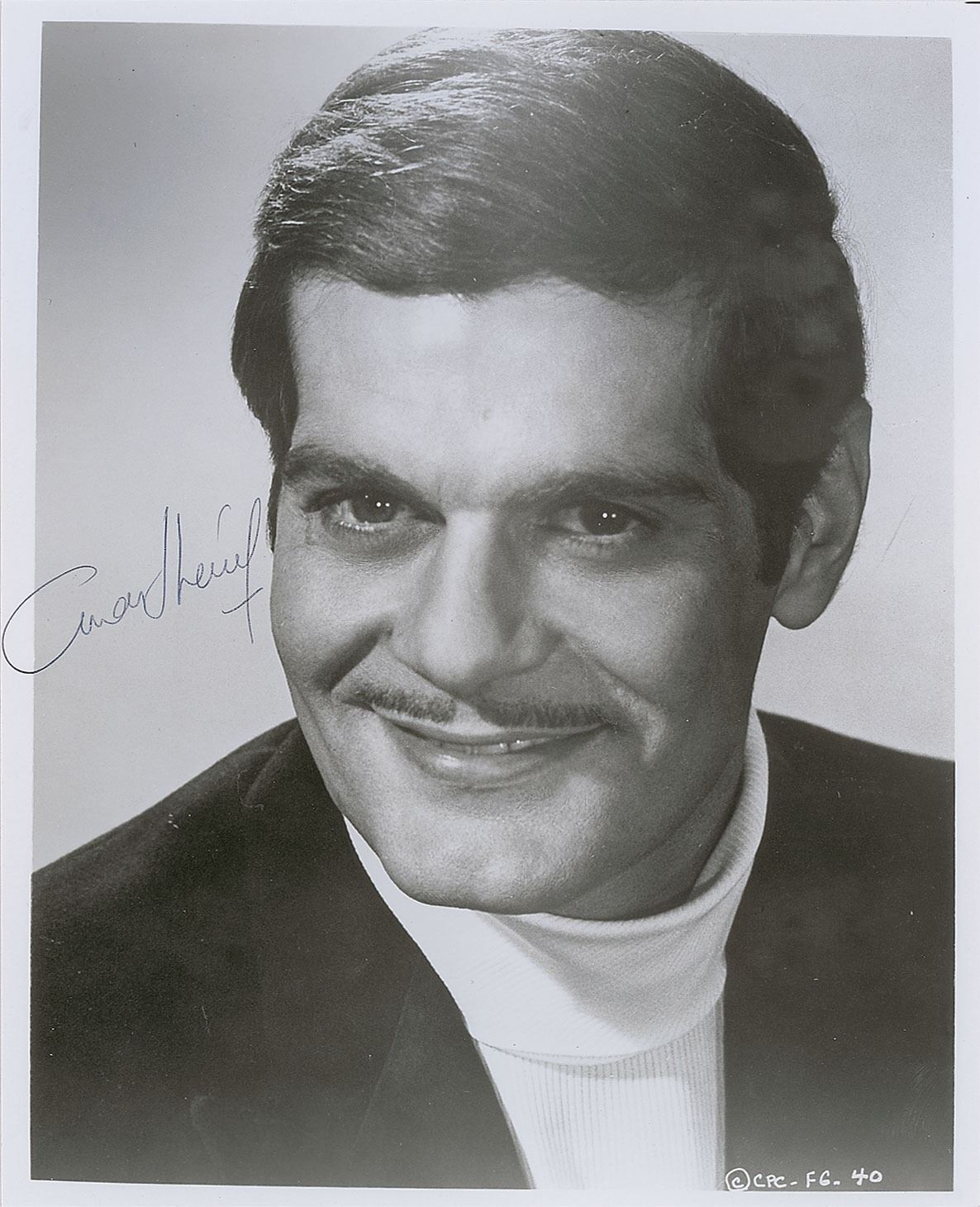Glossy 8 x 9.75 close-up photo of Sharif wearing a dark coat with white turtleneck, signed in black ballpoint. In fine condition.