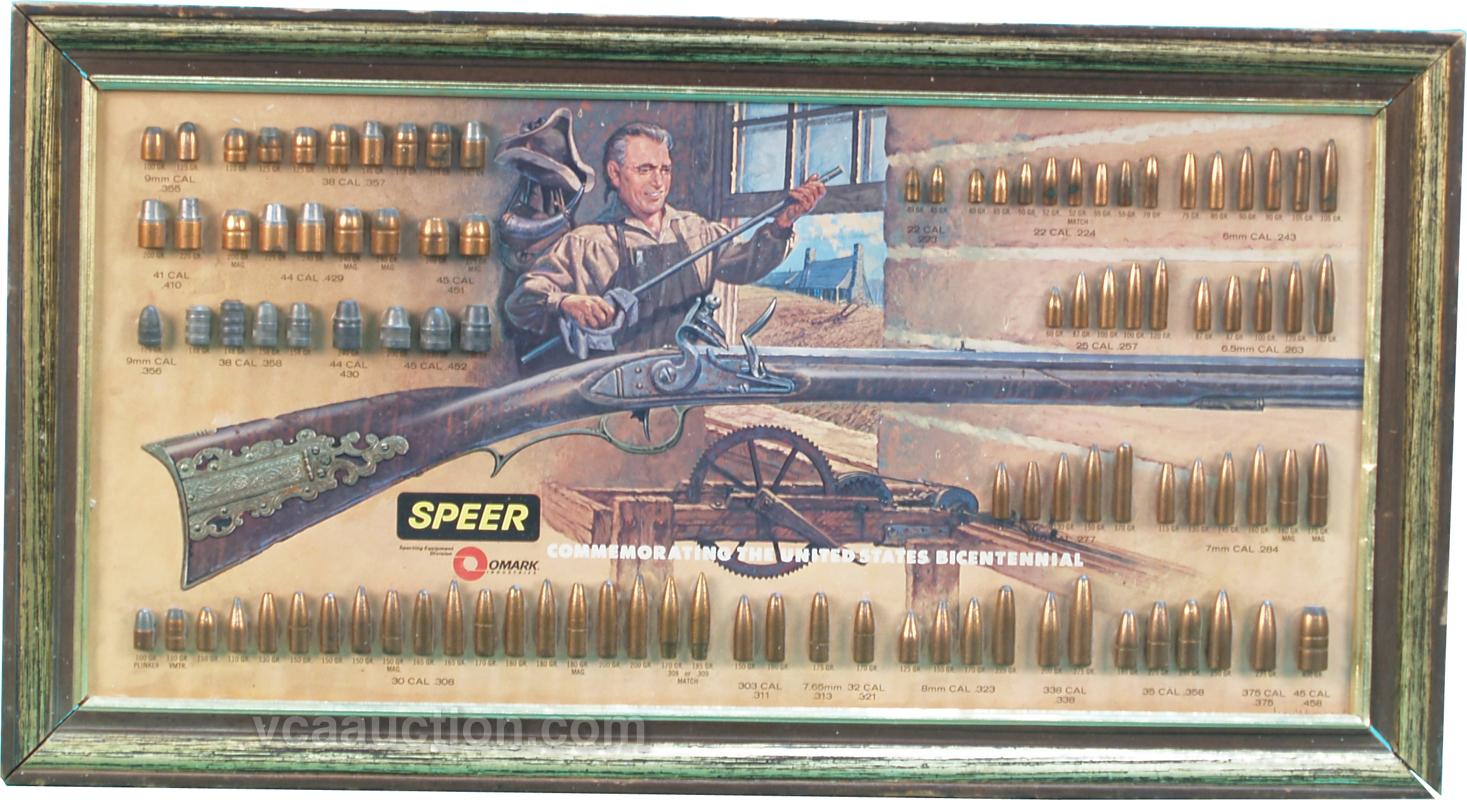 Omark Industries Sporting Equipment Division Cardboard Bullet Caliber Display Sign, "Speer - Commemorating The United States Bicentennial" in wood frame - 21" x 11"