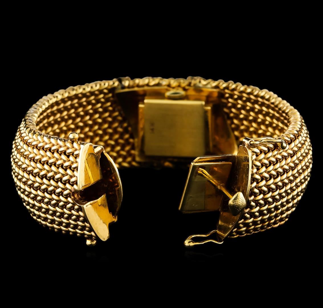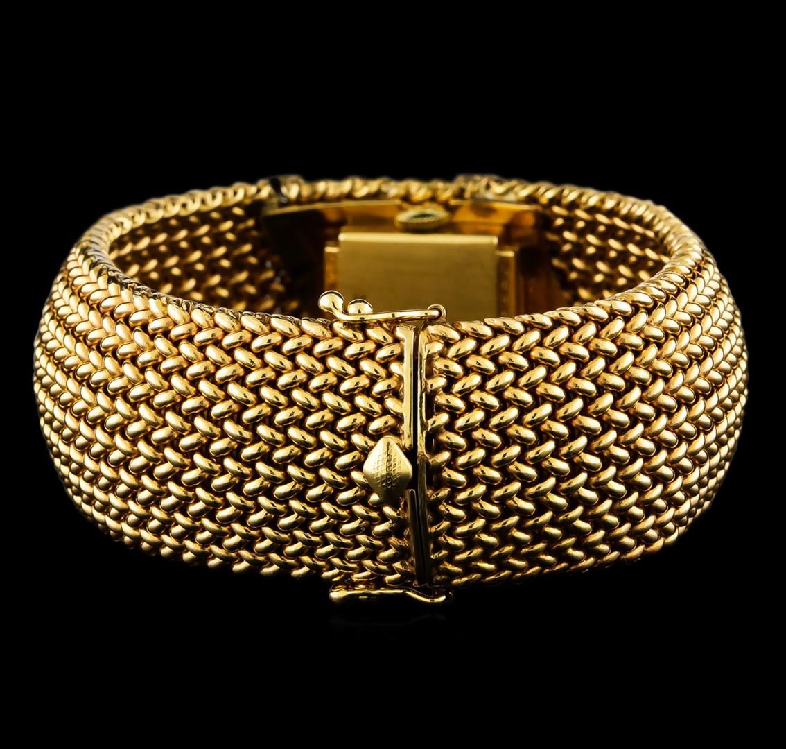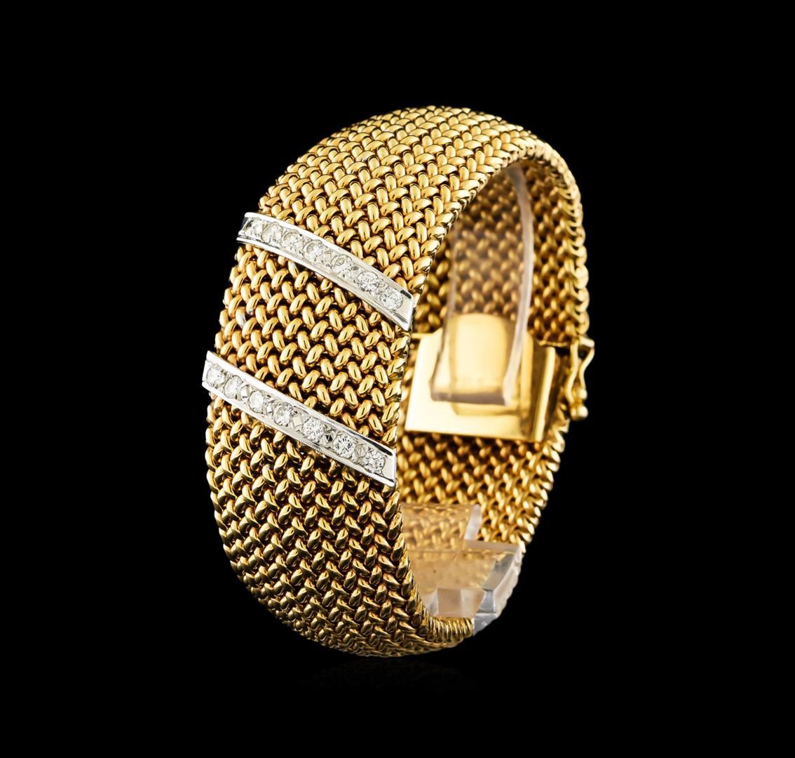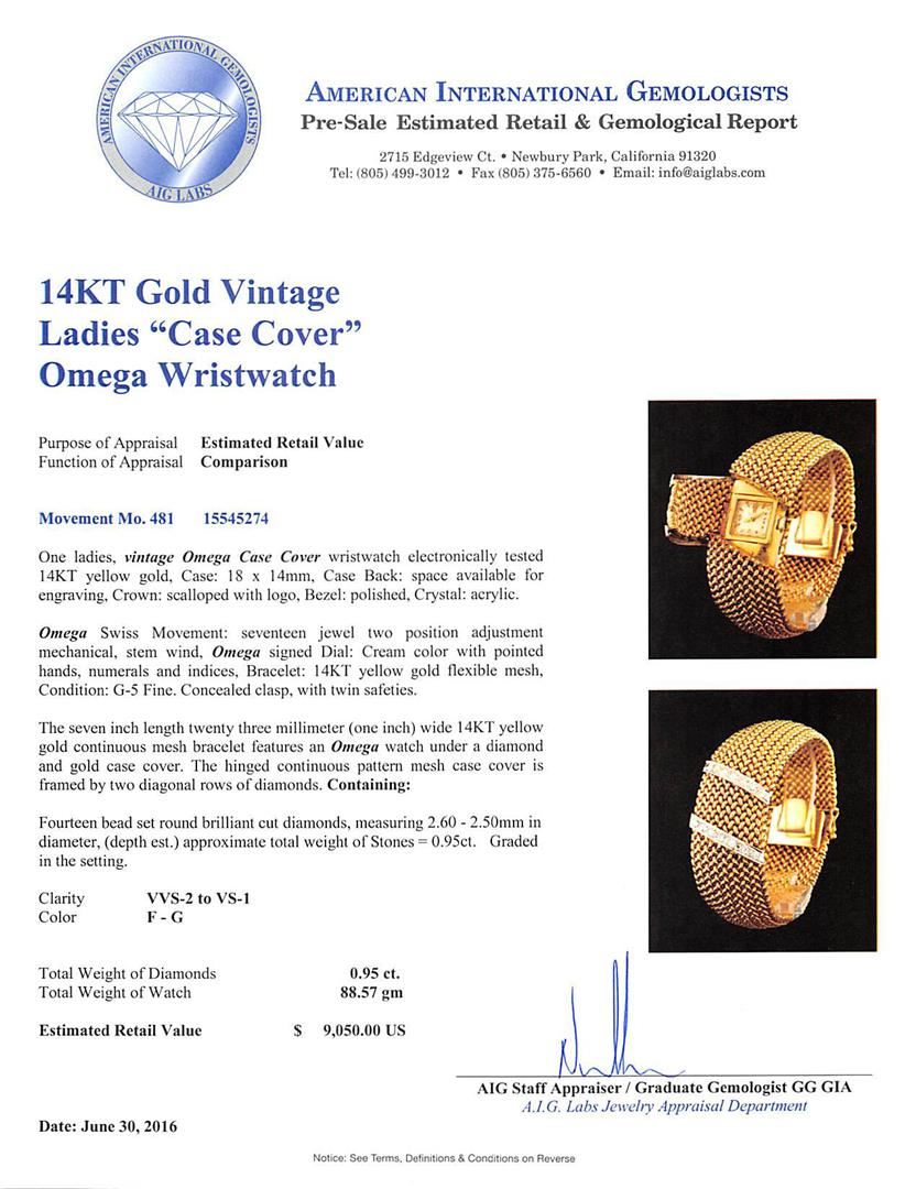 One ladies, vintage Omega Case Cover wristwatch electronically tested 14KT yellow gold, Case: 18 x 14mm, Case Back: space available for engraving, Crown: scalloped with logo, Bezel: polished, Crystal: acrylic. Omega Swiss Movement: seventeen jewel two position adjustment mechanical, stem wind, Omega signed Dial: Cream color with pointed hands, numerals and indices, Bracelet: 14KT yellow gold flexible mesh, Condition: G-5 Fine. Concealed clasp, with twin safeties. The seven inch length twenty three millimeter (one inch) wide 14KT yellow gold continuous mesh bracelet features an Omega watch under a diamond and gold case cover. The hinged continuous pattern mesh case cover is framed by two diagonal rows of diamonds. Containing: Fourteen bead set round brilliant cut diamonds, measuring 2.60 - 2.50mm in diameter, (depth est.) approximate total weight of Stones = 0.95ct. Graded in the setting. Clarity: VVS-2 to VS-1. Color: F - G. Total Weight of Diamonds 0.95ct. Total Weight of Watch 88.57gm. AIG Appraised at $9,050.00.