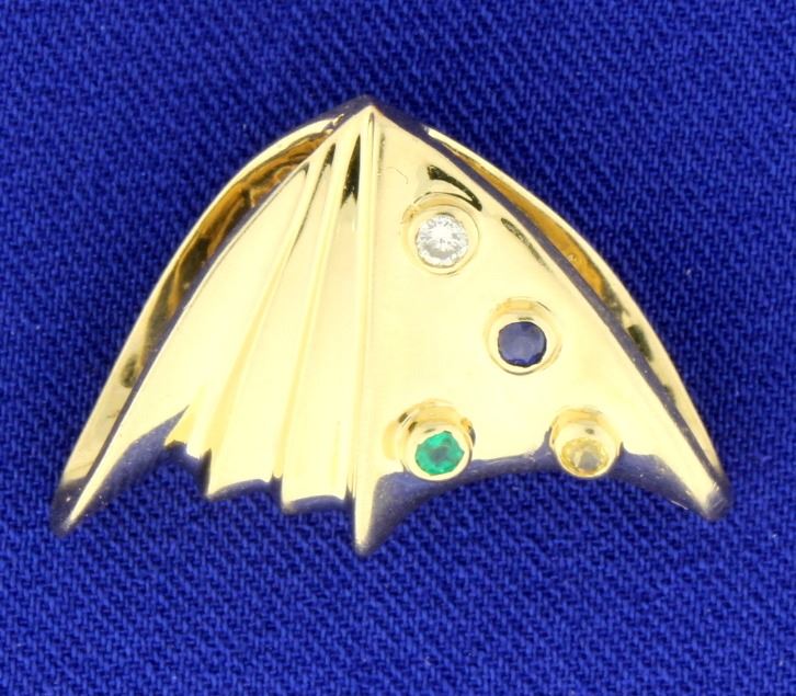 This Omega slide is set in 14k yellow gold and accented with bezel set Citrine, Emerald, Sapphire and diamond. This piece will fit up to a 6mm omega. The slide over 1" long and 1 1/4" wide. 6.8g