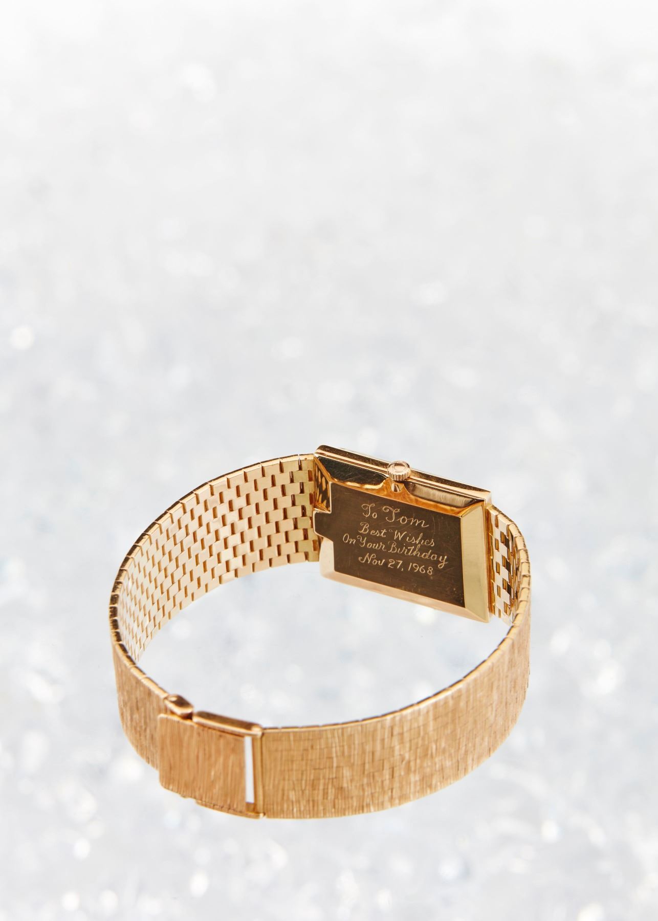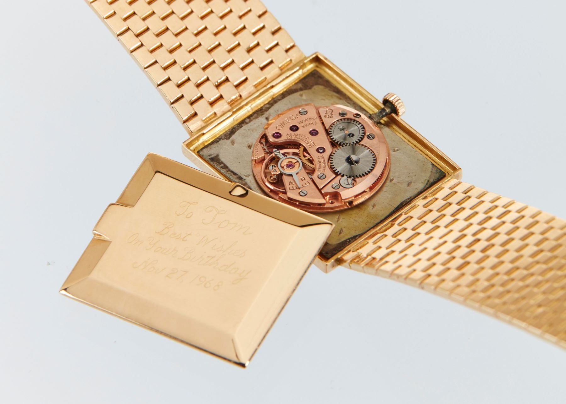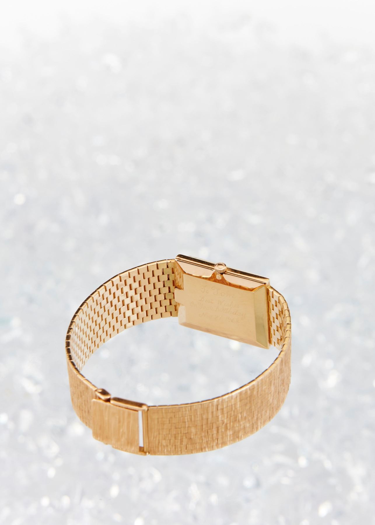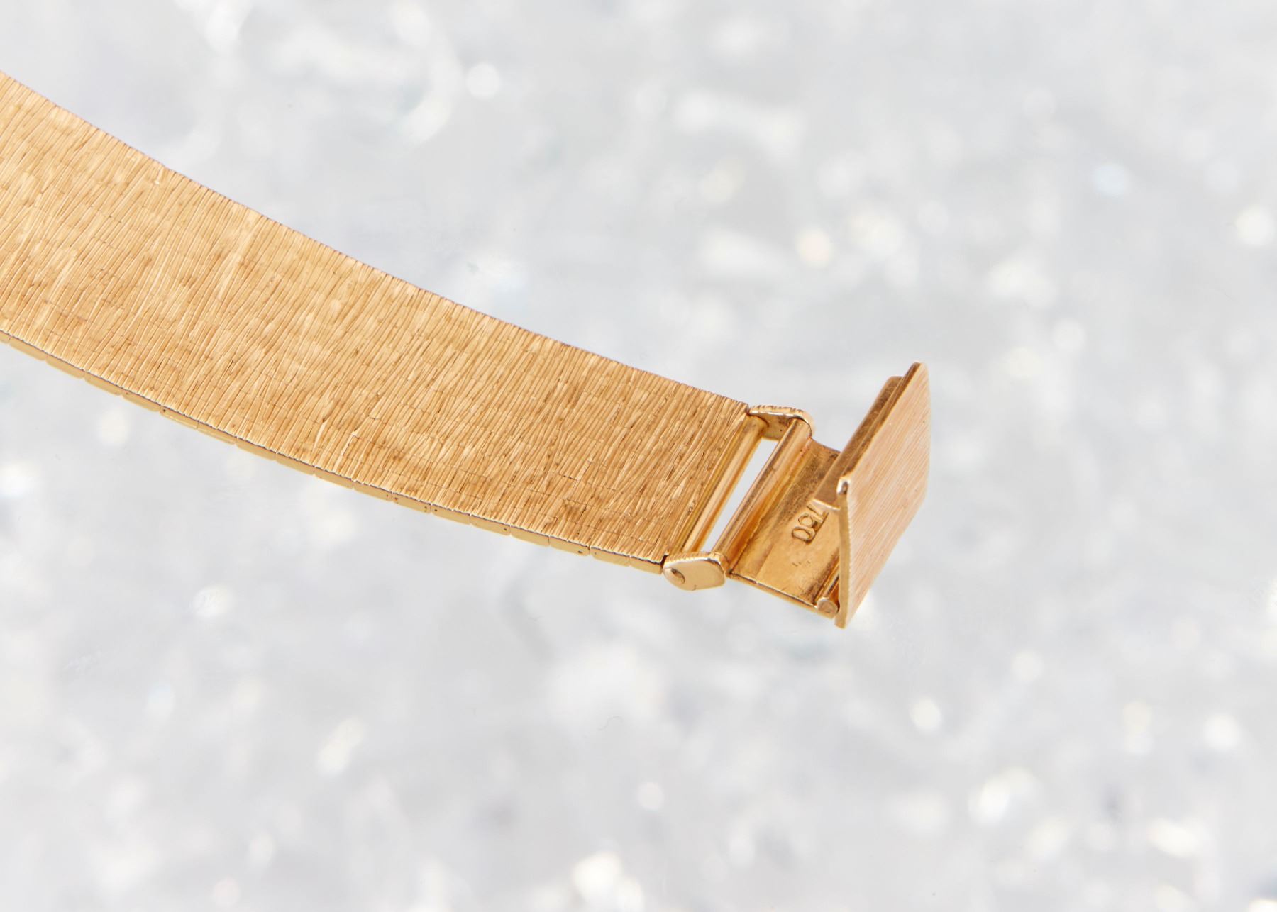 CIRCA: 1967. CASE MATERIAL: 18K Rose Gold. DIAL DIAMETER: 24mm x 21mm. BRACELET MATERIAL: 18K Rose Gold. MOVEMENT: Manual Wind. NOTES: A few scattered oxidation spots to dial. WEIGHT: 65.92g. Est. $1200-1500 DISCLOSURE: Watches were running at time of photography unless otherwise stated. Service history is unknown unless paperwork is provided. We cannot guarantee accuracy of any of the watches offered. "