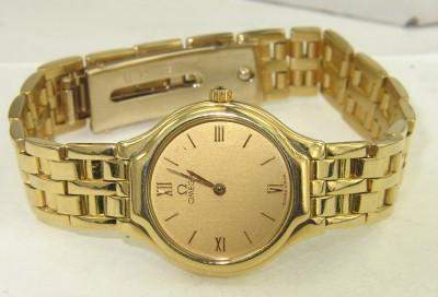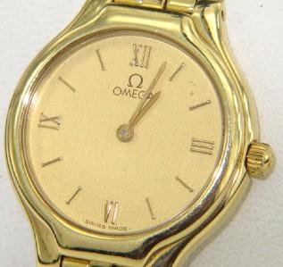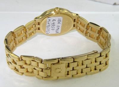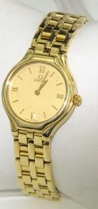 Omega 18K Yellow Gold Watch. Watch's Weight: 57.3 grams. The measurement of watch head : 22 x 22 mm and 4 mm thick. The length of watch: 6.25". Chain is 10 mm wide. Swiss made.