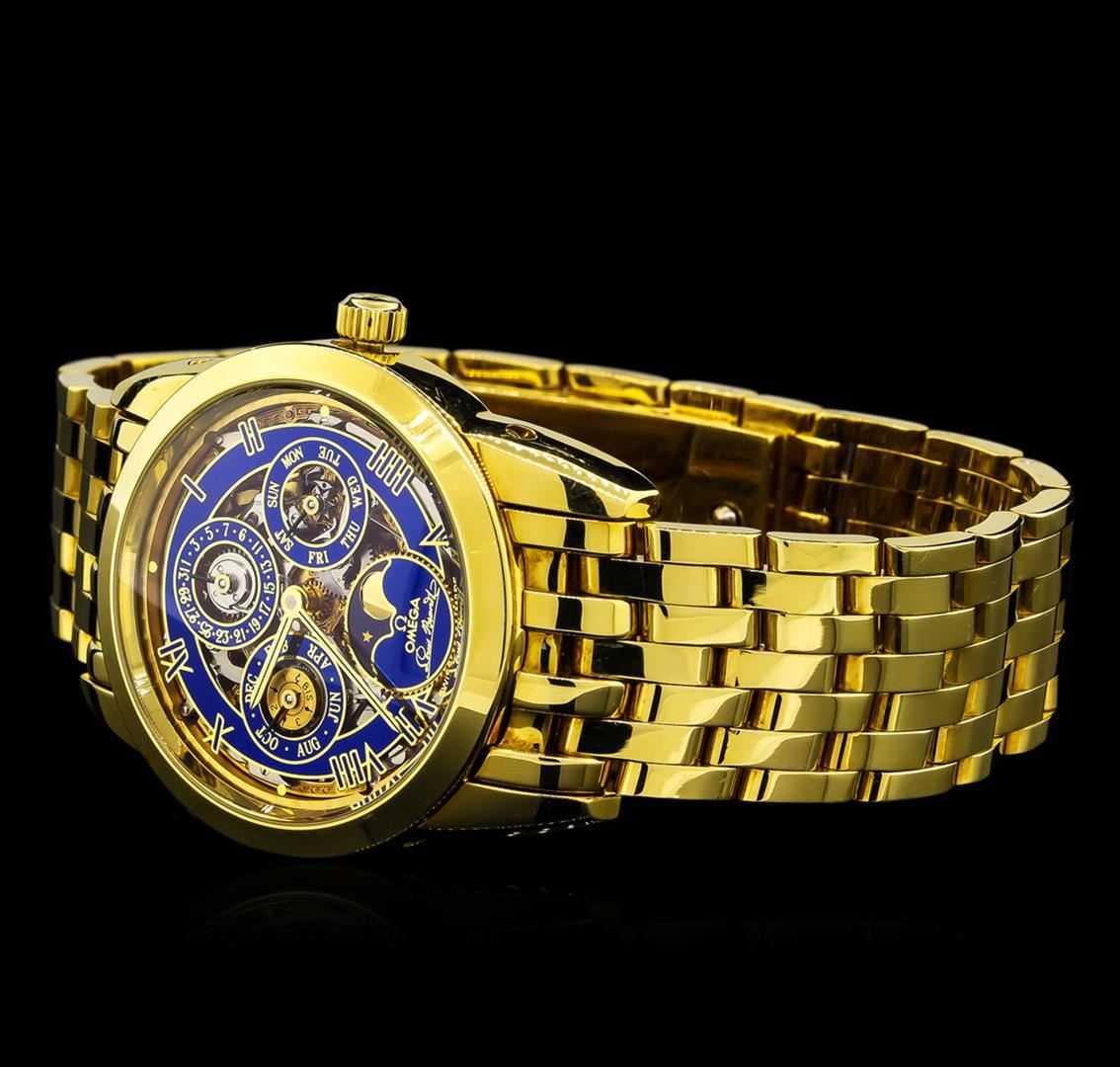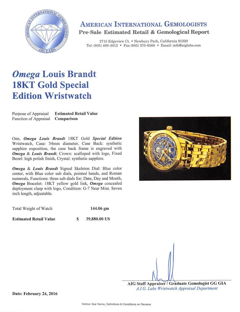 One, Omega Louis Brandt 18KT Gold Special Edition Wristwatch, Case: 34mm diameter, Case Back: synthetic sapphire exposition, the case back frame is engraved with Omega & Louis Brandt, Crown: scalloped with logo, Fixed Bezel: high polish finish, Crystal: synthetic sapphire. Omega & Louis Brandt Signed Skeleton Dial: Blue color center, with Blue color sub dials, pointed hands, and Roman numerals, Functions: three sub dials for; Date, Day and Month, Omega Bracelet: 18KT yellow gold link, Omega concealed deployment clasp with logo, Condition: G-7 Near Mint. Seven inch length, adjustable. Total Weight of Watch144.06gm. AIG Appraised at $39,880.00.
