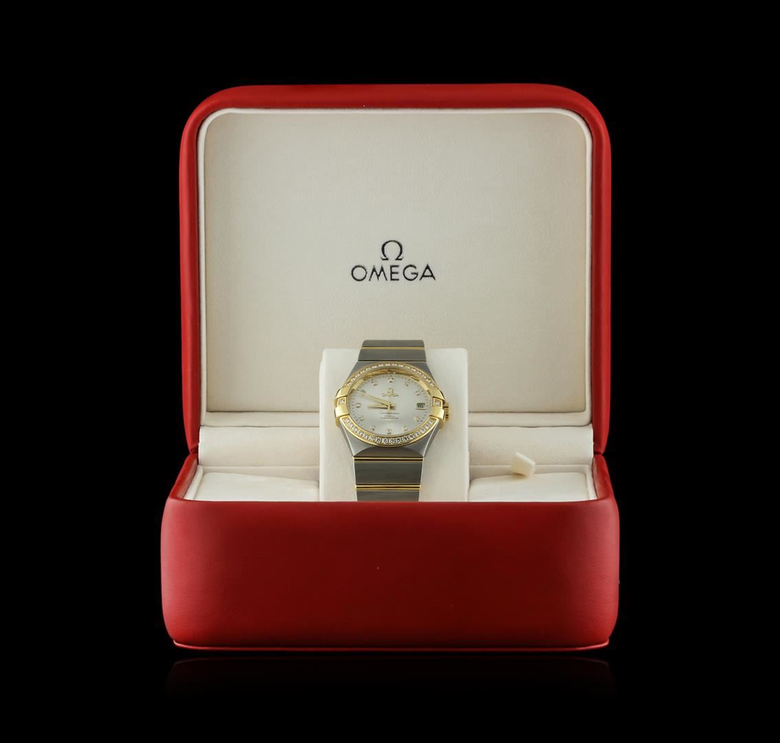 One gents, cast & machine milled Omega two-tone Constellation wristwatch electronically tested. Stainless Steel Case: 36mm, Water Resistant: 100 meters / 330 feet, Exhibition Case Back: with a Stainless Steel frame, engraved with the manufacturers name, model name and info, Logo'd Crown: 18KT yellow gold, set within protective shoulders, Bezel: 18KT yellow gold set with diamonds, Crystal: domed scratch-resistant synthetic sapphire lens. Swiss Movement: automatic, Power Reserve: 60 hours, Dial: Silvered with luminous hands and diamond markers, Calendar: 3 o'clock position date display, Bracelet: integrated stainless steel & 18KT yellow gold full bar, Condition: G-7 Near Mint. Eight inch length, with a push button adjustable deployment clasp. Containing: Thirty Four prong set round brilliant cut diamonds, approximate total weight = 1.02ct. Set & graded in the bezel. Clarity: VVS-1 to VVS-2. Color: E - F. Total Weight of Diamonds 1.02ct. Total Weight of Watch 143.53gm. AIG Appraised at $18,000.00.