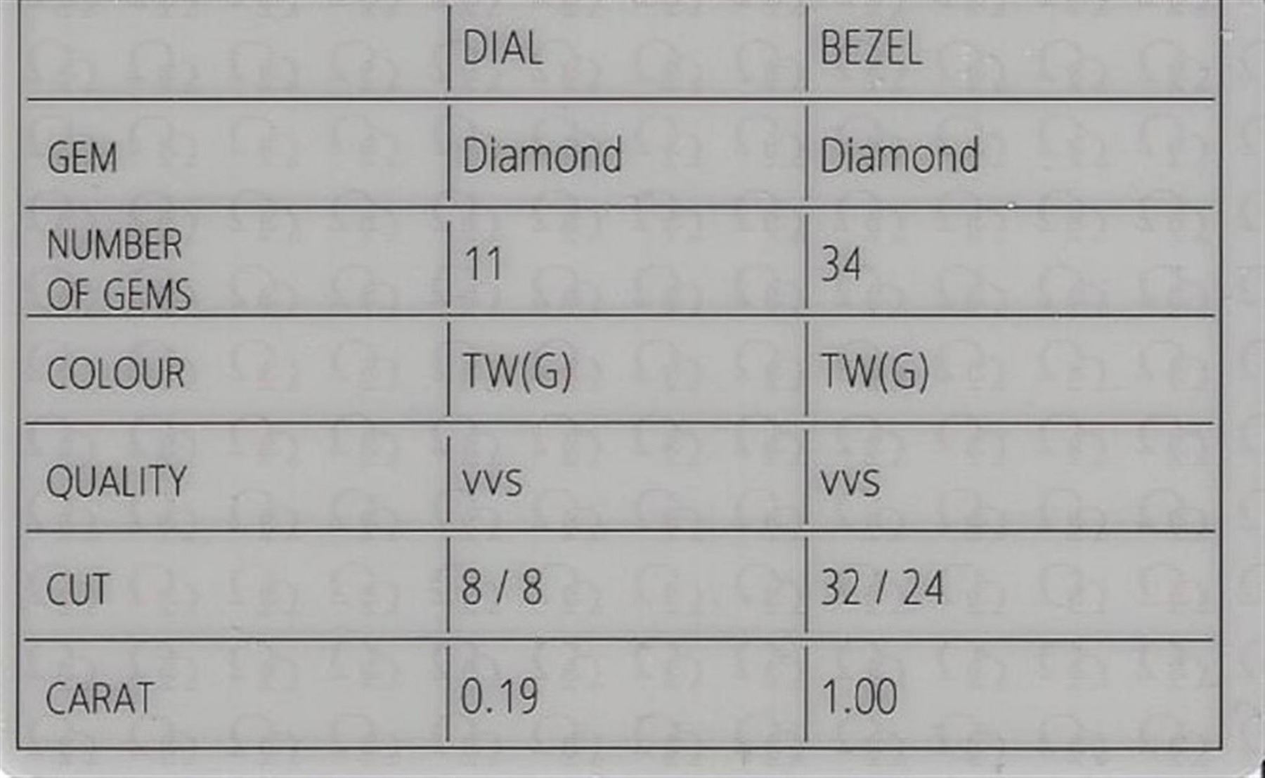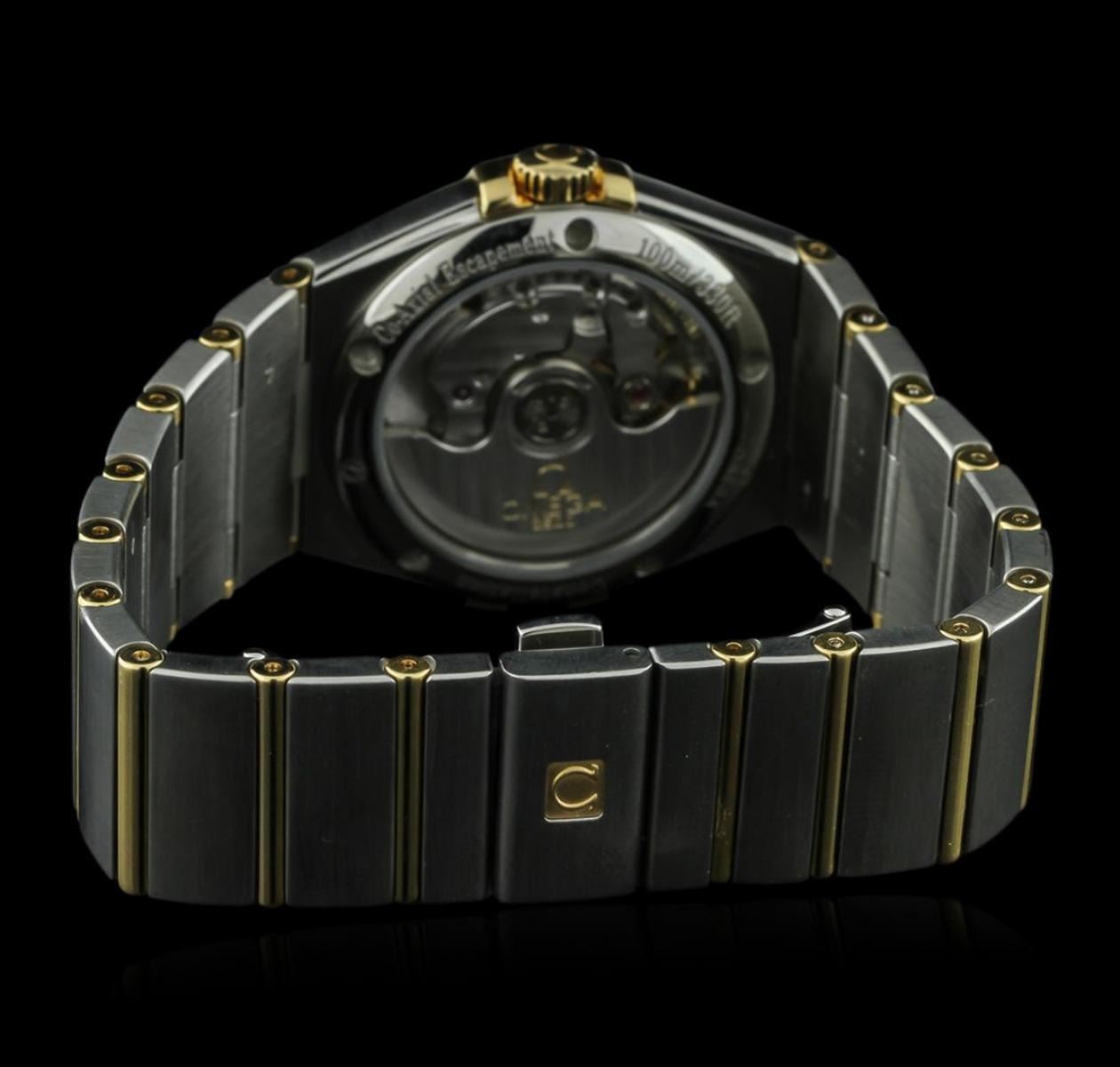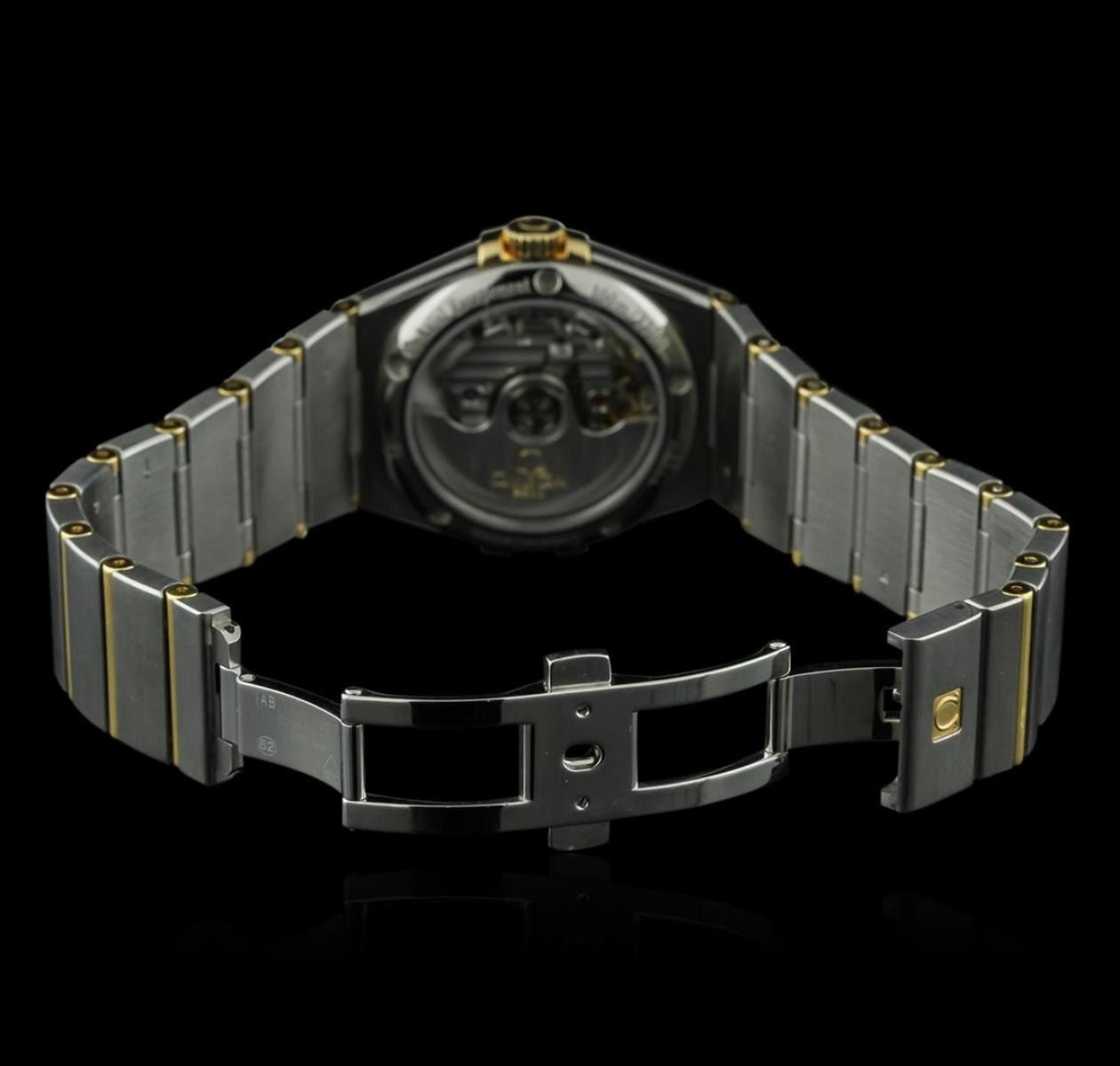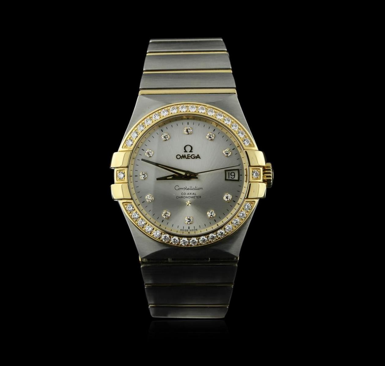 One gents, cast & machine milled Omega two-tone Constellation wristwatch electronically tested. Stainless Steel Case: 36mm, Water Resistant: 100 meters / 330 feet, Exhibition Case Back: with a Stainless Steel frame, engraved with the manufacturers name, model name and info, Logo'd Crown: 18KT yellow gold, set within protective shoulders, Bezel: 18KT yellow gold set with diamonds, Crystal: domed scratch-resistant synthetic sapphire lens. Swiss Movement: automatic, Power Reserve: 60 hours, Dial: Silvered with luminous hands and diamond markers, Calendar: 3 o'clock position date display, Bracelet: integrated stainless steel & 18KT yellow gold full bar, Condition: G-7 Near Mint. Eight inch length, with a push button adjustable deployment clasp. Containing: Thirty Four prong set round brilliant cut diamonds, approximate total weight = 1.02ct. Set & graded in the bezel. Clarity: VVS-1 to VVS-2. Color: E - F. Total Weight of Diamonds 1.02ct. Total Weight of Watch 143.53gm. AIG Appraised.