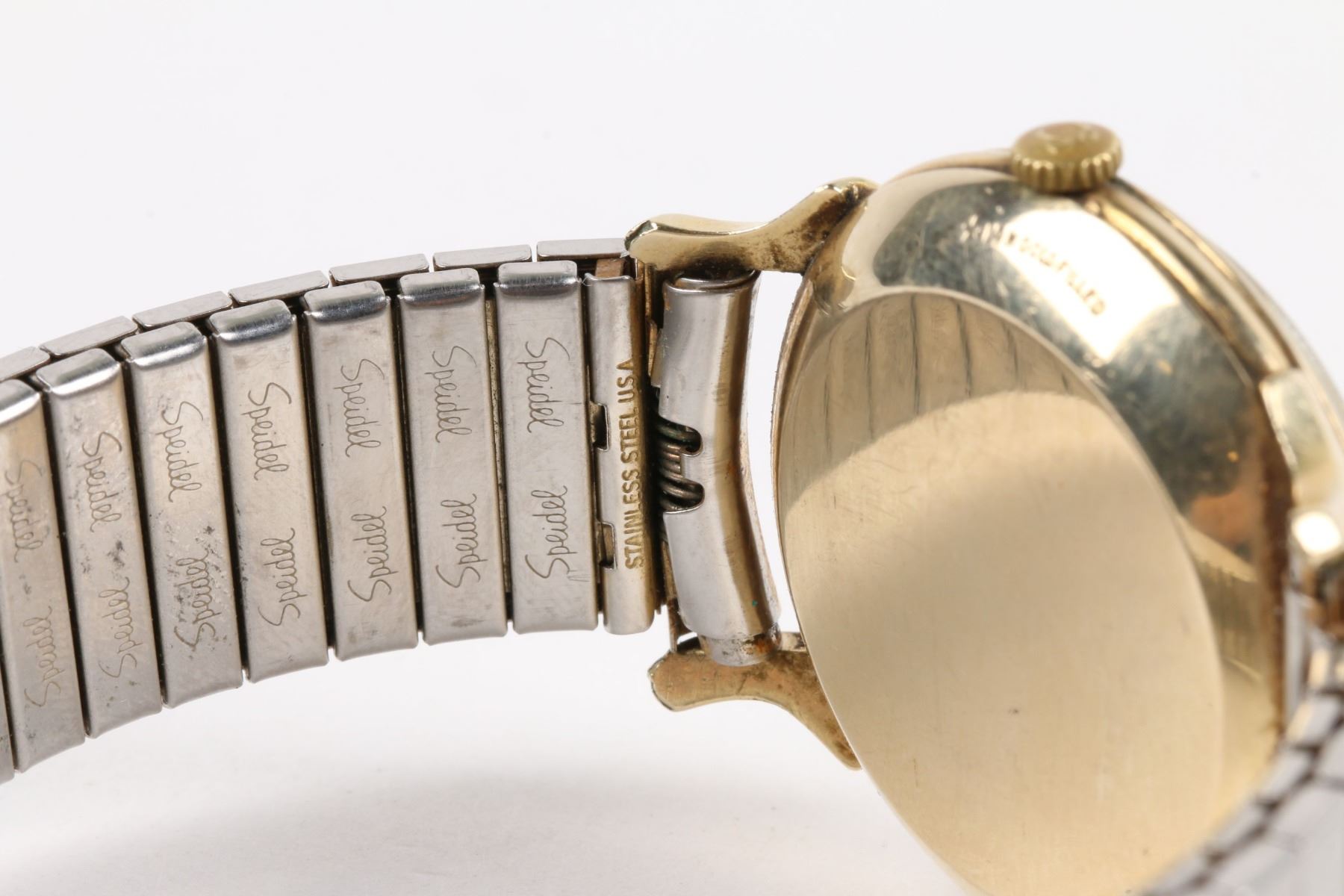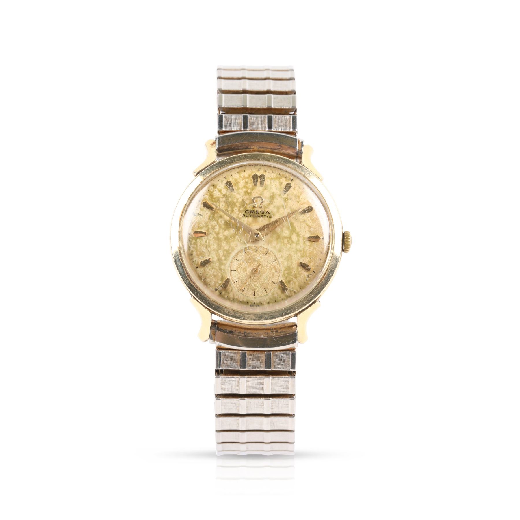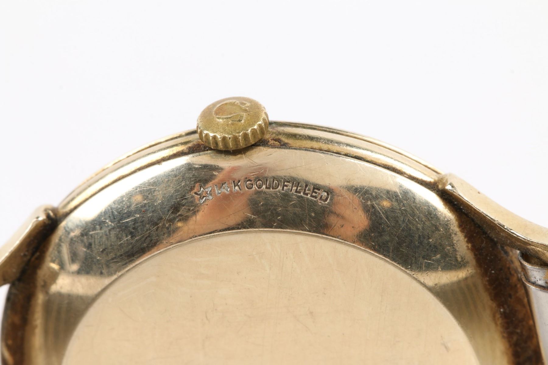 CIRCA: 1952. CASE MATERIAL: 14K Gold Filled. DIAL DIAMETER: 28mm. BRACELET MATERIAL: Stainless Steel. MOVEMENT: Caliber 342 "Bumper" Automatic. NOTES: Dial exhibits heavy patina. Minor oxidation evident on movement. WEIGHT: 53.5g. Est. $200-300 DISCLOSURE: Watches were running at time of photography unless otherwise stated. Service history is unknown unless paperwork is provided. We cannot guarantee accuracy of any of the watches offered. "