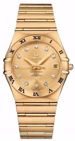 Model: 111.50.36.20.58.001 - CASE = [Material:18k Yellow Gold], [Case Diameter:35.5], [Bezel:Fixed 18k Yellow Gold Engraved with Roman Numerals], [Case Back:See-thru Sapphire crystal], [Water Resistant:50 Meters - 165 Feet], [Crystal:Scratch Resistant Sapphire],; DIAL = [Color:Champagne with 11 Diamond Hour Markers and Date at 3],; MOVEMENT = [Type:Automatic Self Winding Co-Axial Chronometer with Approx. 44hr Power Reserve], [Crown:18k Yellow Gold Screw Down],; BAND = [Clasp:Deployment Buckle], [Type:Brushed and Polished 18k Yellow Gold], (Usually ships in 2 to 4 weeks.)