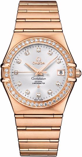 Model: 111.55.36.20.52.001 - CASE = [Material:18k Rose Gold], [Case Diameter:35.5], [Bezel:Fixed 18k Rose Gold Set with Diamonds], [Case Back:See-thru Sapphire crystal], [Water Resistant:50 Meters - 165 Feet], [Crystal:Scratch Resistant Sapphire],; DIAL = [Color:Silver with 11 Diamond Hour Markers and Date at 3],; MOVEMENT = [Type:Automatic Self Winding Co-Axial Chronometer with Approx. 44hr Power Reserve], [Crown:18k Rose Gold Screw Down],; BAND = [Clasp:Deployment Buckle], [Type:Brushed and Polished 18k Rose Gold], (Usually ships in 2 to 4 weeks.)