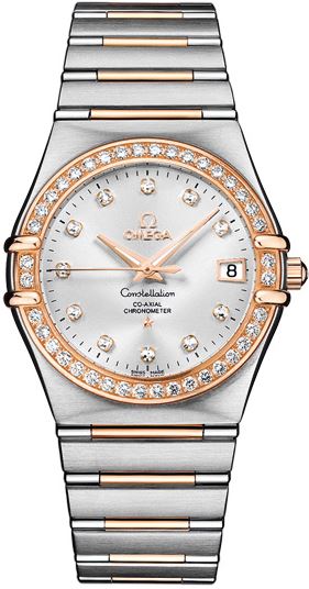 Model: 111.25.36.20.52.001 - CASE = [Material:Brushed and Polished Stainless Steel], [Case Diameter:35.5], [Bezel:Fixed 18k Rose Gold Set with Diamonds], [Case Back:See-thru Sapphire crystal], [Water Resistant:50 Meters - 165 Feet], [Crystal:Scratch Resistant Sapphire], DIAL = [Color:Silver with 11 Diamond Hour Markers and Date at 3], MOVEMENT = [Type:Automatic Self Winding Co-Axial Chronometer with Approx. 44hr Power Reserve], [Crown:18k Rose Gold Screw Down], BAND = [Clasp:Deployment Buckle], [Type:Brushed with Polished Stainless Steel and Rose Gold Center Bar], (Usually ships in 2 to 4 weeks.)