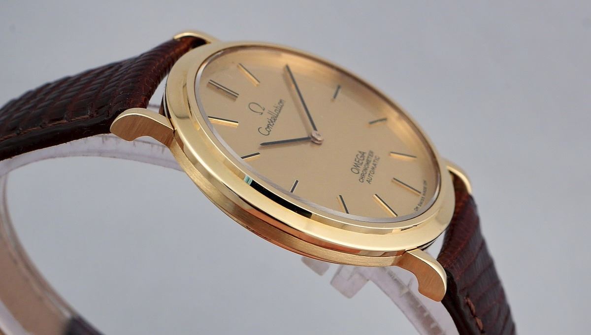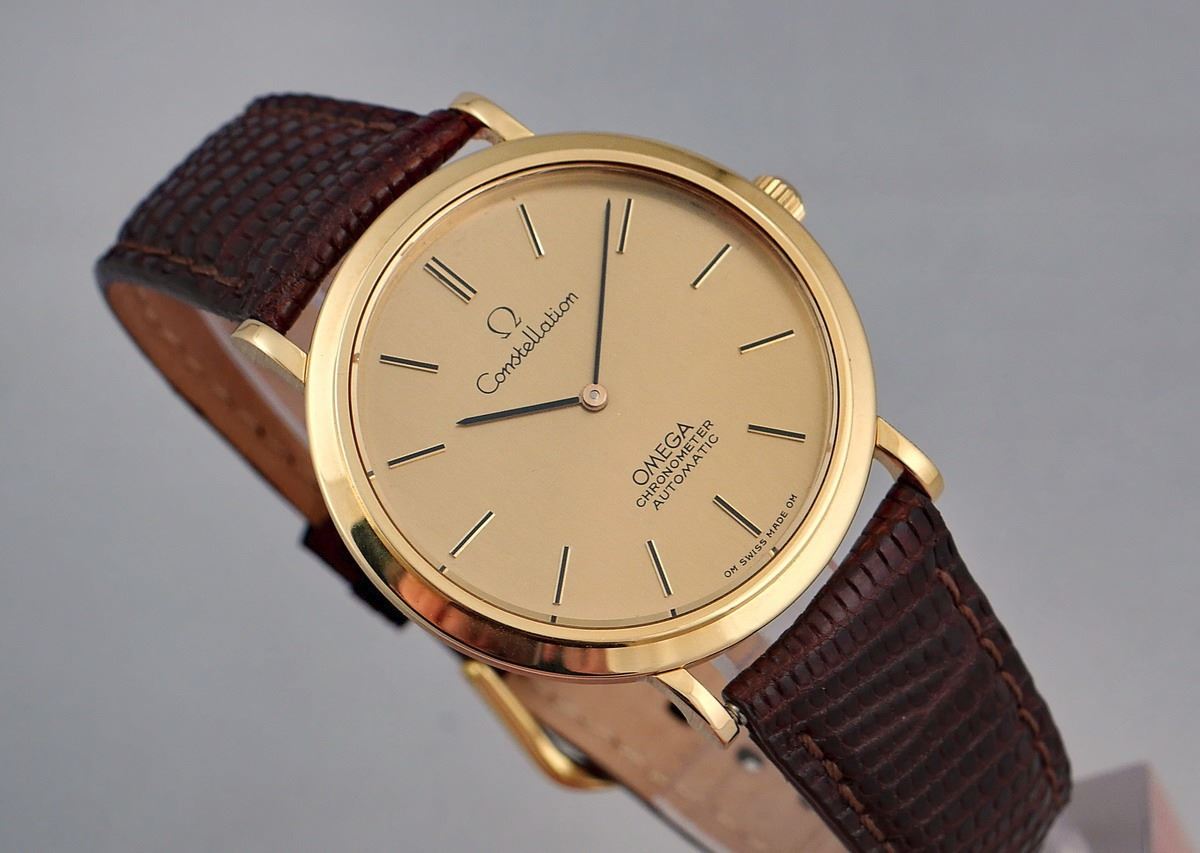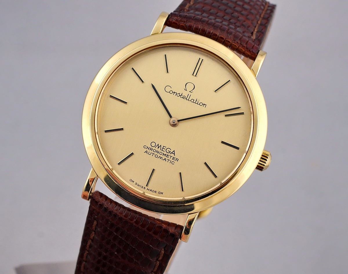 Offered for sale this outstanding vintage men's watch: the OMEGA CONSTELLATION AUTOMATIC CHRONOMETER, ref. # 1570001, in a solid 18K yellow-gold case with nicely shaped lugs, manufactured in 1968 according to the movement's serial number. This is a rare thin Omega Constellation model with an ultra-thin Omega 711 caliber movement. The watch is all-original, excepting the newer band, and is a desirable piece for Omega Constellation collectors. It comes in a vintage Omega red zipped box.