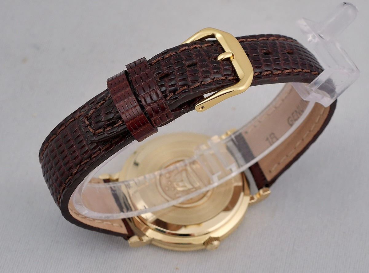 brand-new ""Alpine"" 18 mm brown lizard leather band, non-signed yellow-gold color buckle; total length of the watch with band and buckle 9"" (23 cm)."