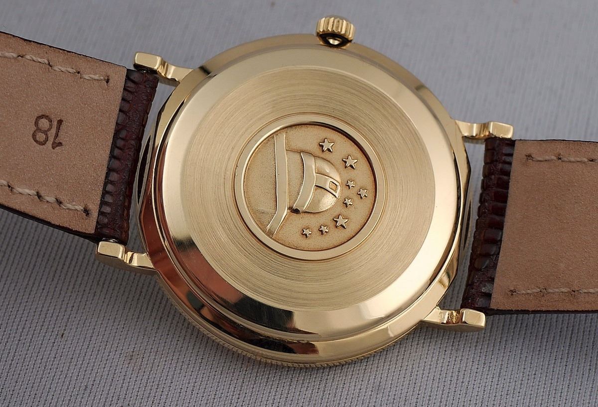 The watch sports a beautiful original 18k solid-gold clean dial (stamped with a gold hallmark on the back side), original 18k solid-gold winding crown and an original scratch-free sapphire crystal. The heavy solid-gold case has sharp and clean edges, the famous Observatory and stars emblem on the back cover looks like new.