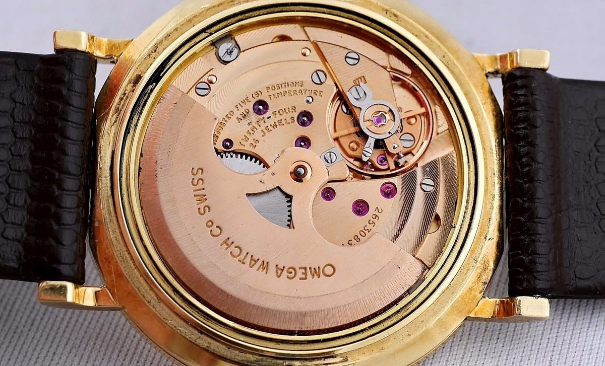 This timepiece is equipped with one of the best Omega automatic full-rotor chronometer-grade movements: a genuine rose-gold gilt Omega 24 jewels 711 Caliber, adjusted to five positions and temperature. It's a thinnest automatic caliber ever made by Omega, only 3 mm that allows to produce a watch just 7 mm in thickness. The watch has been just fully overhauled and serviced by a certified watchmaker, and is excellent-running and keeping time, supplied with a brand-new leather band, ready to wear and enjoy or to grace your vintage watches collection.