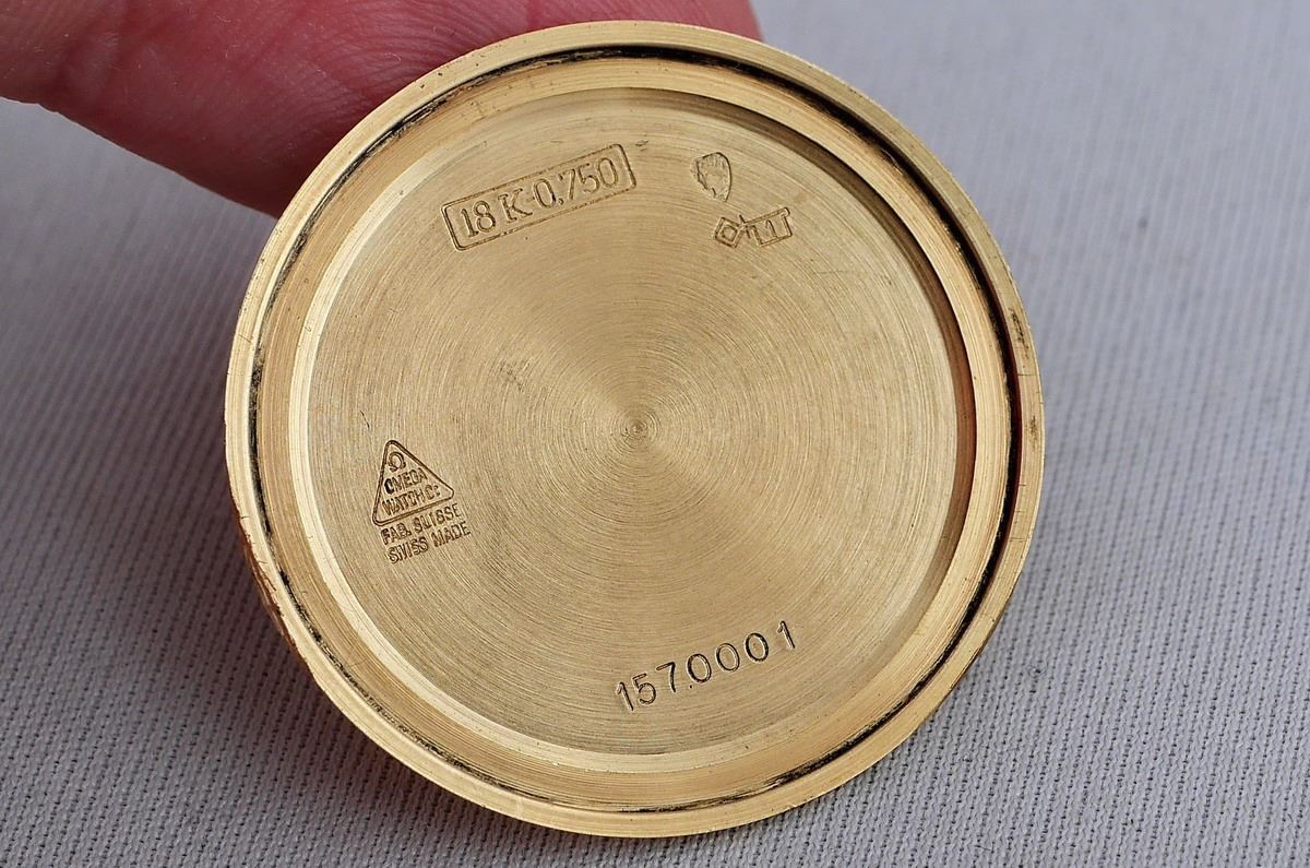 width - 34,5 mm (without winding crown); length - 39 mm (including lugs); thickness - 7 mm; total weight with band and buckle - 47 g. ref. # 1570001; solid 18K yellow-gold; Swiss made; three-piece; faceted lugs; snap back with Observatory emblem; original 18k gold signed Omega winding crown; original sapphire crystal;