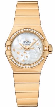 Model: 123.55.27.20.05.001 - CASE = [Material:Brushed and Polished 18k Yellow Gold], [Case Diameter:27], [Bezel:Fixed, Set with Diamonds], [Case Back:See-thru Sapphire crystal], [Water Resistant:100 Meters/330 Feet], [Crystal:Anti-Reflective Scratch Resistant Sapphire],; DIAL = [Color:White Mother of Pearl Star Designed with Date at 3],; MOVEMENT = [Type:Co Axial Chronometer - Automatic Self Winding Omega 8520 with Approx. 50hr Power Reserve],; BAND = [Clasp:Double Folding Push Button], [Type:Brushed and Polished 18k Yellow Gold], (Usually ships in 2 to 4 weeks.)