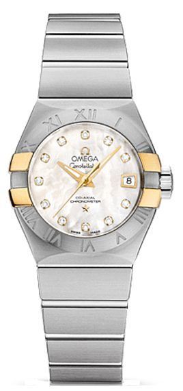 Model: 123.20.27.20.55.005 - CASE = [Material:Stainless Steel & Yellow Gold], [Case Diameter:27], [Case Thickness:9mm], [Case Back:See-thru Sapphire crystal], [Water Resistant:100 Meters - 330 Feet], [Crystal:Anti-Reflective Scratch Resistant Sapphire], DIAL = [Color:Mother of Pearl with Diamond Markers], MOVEMENT = [Type:Automatic Self Winding - Chronometer Omega Caliber 5820], BAND = [Clasp:Push Button Foldover Clasp], [Type:Brushed and Polished Stainless Steel], (Usually ships in 2 to 4 weeks.)