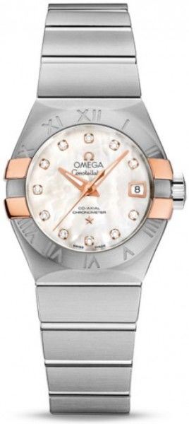 Model: 123.20.27.20.55.004 - CASE = [Material:Stainless Steel & Rose Gold], [Case Diameter:27], [Case Thickness:9mm], [Case Back:See-thru Sapphire crystal], [Water Resistant:100 Meters - 330 Feet], [Crystal:Anti-Reflective Scratch Resistant Sapphire], DIAL = [Color:Mother of Pearl with Diamond Markers], MOVEMENT = [Type:Automatic Self Winding - Chronometer Omega Caliber 8520], BAND = [Clasp:Push Button Foldover Clasp], [Type:Brushed and Polished Stainless Steel], (Usually ships in 2 to 4 weeks.)