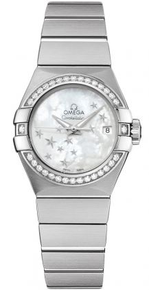 Model: 123.15.27.20.05.001 - CASE = [Material:Brushed and Polished Steel], [Case Diameter:27], [Bezel:Fixed, Set with Diamonds], [Case Back:See-thru Sapphire crystal], [Water Resistant:100 Meters/330 Feet], [Crystal:Anti-Reflective Scratch Resistant Sapphire], DIAL = [Color:White Mother of Pearl Star Designed with Date at 3], MOVEMENT = [Type:Co Axial Chronometer - Automatic Self Winding Omega 8520 with Approx. 50hr Power Reserve], BAND = [Clasp:Double Folding Push Button], [Type:Brushed and Polished Stainless Steel], (Usually ships in 2 to 4 weeks.)