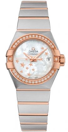 Model: 123.25.27.20.05.002 - CASE = [Material:Brushed Stainless Steel and Rose Gold], [Case Diameter:27], [Bezel:Fixed, Set with Diamonds], [Case Back:See-thru Sapphire crystal], [Water Resistant:100 Meters/330 Feet], [Crystal:Anti-Reflective Scratch Resistant Sapphire], DIAL = [Color:White Mother of Pearl Star Designed with Date at 3], MOVEMENT = [Type:Co Axial Chronometer - Automatic Self Winding Omega 8520 with Approx. 50hr Power Reserve], BAND = [Clasp:Double Folding Push Button], [Type:Brushed Stainless Steel and Rose Gold], (Usually ships in 2 to 4 weeks.)