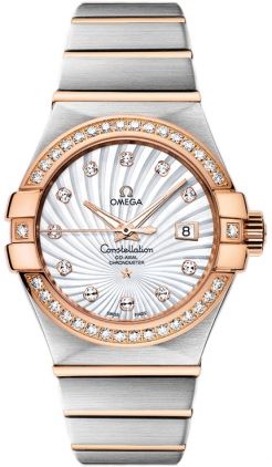 Model: 123.25.31.20.55.001 - Case,; MATERIALSTEEL/18KT ROSE GOLD = [Case Diameter31], [Case BackSolid], [Water Resistant100 Meters/330 Feet], [CrystalScratch Resistant Sapphire], Dial,; COLORWHITE MOTHER OF PEARL GUILLOCHE DIAMOND = Movement,; TYPEBATTERY POWERED QUARTZ = Band,; CLASPDEPLOYMENT BUCKLE = [TypeSteel/18kt Rose Gold], (Usually ships in 4 to 8 weeks.)