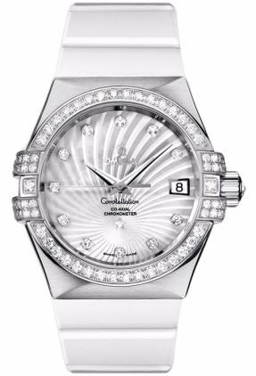 Model: 123.57.35.20.55.005 - CASE = [Material:18kt White Gold], [Case Diameter:35], [Case Back:Solid], [Water Resistant:100 Meters/330 Feet], [Crystal:Scratch Resistant Sapphire],; DIAL = [Color:White Mother Of Pearl Guilloche/Diamond],; MOVEMENT = [Type:Automatic Self Winding],; BAND = [Clasp:Deployment Buckle], [Type:White Rubber], (Usually ships in 2 to 4 weeks.)