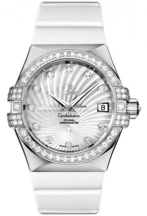 Model: 123.57.35.20.55.005 - CASE = [Material:18kt White Gold], [Case Diameter:35], [Case Back:Solid], [Water Resistant:100 Meters/330 Feet], [Crystal:Scratch Resistant Sapphire], DIAL = [Color:White Mother Of Pearl Guilloche/Diamond], MOVEMENT = [Type:Automatic Self Winding], BAND = [Clasp:Deployment Buckle], [Type:White Rubber], (Usually ships in 2 to 4 weeks.)