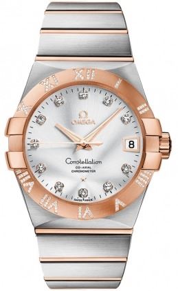 Model: 123.25.38.21.52.003 - CASE = [Material:Brushed Steel/18kt Rose Gold], [Case Diameter:38], [Bezel:Fixed 18k Rose Gold, Roman Numerals Set with Diamonds], [Case Back:See-thru Sapphire crystal], [Water Resistant:100 Meters/330 Feet], [Crystal:Anti-Reflective Scratch Resistant Sapphire],; DIAL = [Color:Silver with Diamond Hour Markers and dat at 3],; MOVEMENT = [Type:Co Axial Chronometer - Automatic Self Winding Omega 8500 with Approx. 60hr Power Reserve],; BAND = [Clasp:Deployment Buckle], [Type:Steel/18kt Rose Gold], (Usually ships in 2 to 4 weeks.)