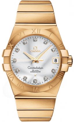 Model: 123.50.38.21.52.002 - CASE = [Material:18kt Gold], [Case Diameter:38], [Case Back:Solid], [Water Resistant:100 Meters/330 Feet], [Crystal:Scratch Resistant Sapphire], DIAL = [Color:Silver/Diamonds], MOVEMENT = [Type:Automatic Self Winding], BAND = [Clasp:Deployment Buckle], [Type:18kt Gold], (Usually ships in 2 to 4 weeks.)