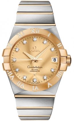 Model: 123.25.38.21.58.002 - CASE = [Material:Brushed Stainless Steel & Gold], [Case Diameter:38], [Bezel:Fixed 18k Yellow Gold, Roman Numerals Set with Diamonds], [Case Back:See-thru Sapphire crystal], [Water Resistant:100 Meters - 330 Feet], [Crystal:Anti-Reflective Scratch Resistant Sapphire], DIAL = [Color:Champagne with Diamond Hour Markers and dat at 3], MOVEMENT = [Type:Co Axial Chronometer - Automatic Self Winding Omega 8500 with Approx. 60hr Power Reserve], BAND = [Clasp:Push Button Foldover Clasp], [Type:Steel & Yellow Gold Brushed], (Usually ships in 2 to 4 weeks.)