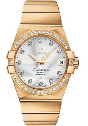 Model: 123.55.38.21.52.002 - CASE = [Material:18kt Gold], [Case Diameter:38], [Case Back:Solid], [Water Resistant:100 Meters/330 Feet], [Crystal:Scratch Resistant Sapphire], DIAL = [Color:Silver/Diamond], MOVEMENT = [Type:Automatic Self Winding], BAND = [Clasp:Deployment Buckle], [Type:18kt Gold], (Usually ships in 2 to 4 weeks.)