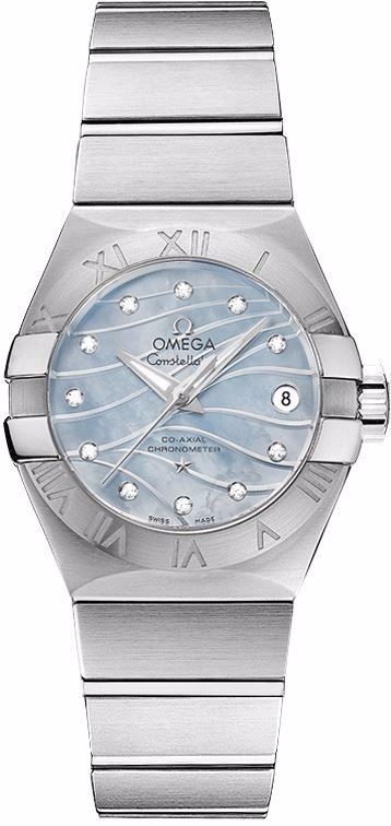 Model: 123.10.27.20.57.001 - CASE = [Material:Stainless Steel], [Case Diameter:27], [Case Thickness:9mm], [Bezel:Fixed], [Case Back:Skeleton], [Water Resistant:100 Meters - 330 Feet], [Crystal:Scratch Resistant Sapphire],; DIAL = [Color:Blue Mother of Pearl with Wavy Pattern and Diamonds],; MOVEMENT = [Type:Automatic Chronometer], [Crown:Push In],; BAND = [Clasp:Folding], [Type:Stainless Steel], (Usually ships in 2 to 4 weeks.)