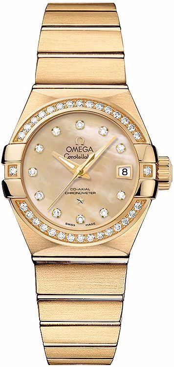 Model: 123.55.27.20.57.002 - CASE = [Material:18kt Yellow Gold], [Case Diameter:27], [Case Thickness:9mm], [Bezel:Fixed with Diamonds], [Case Back:Skeleton], [Water Resistant:100 Meters - 330 Feet], [Crystal:Scratch Resistant Sapphire],; DIAL = [Color:Champagne Mother of Pearl with Diamonds],; MOVEMENT = [Type:Automatic Chronometer], [Crown:Push In],; BAND = [Clasp:Folding], [Type:18kt Yellow Gold], (Usually ships in 2 to 4 weeks.)