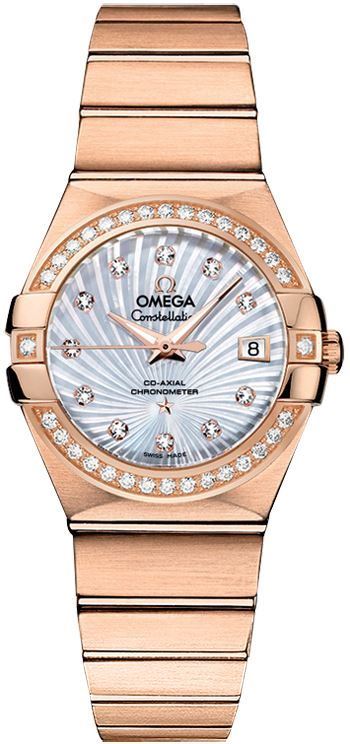 Model: 123.55.27.20.55.001 - CASE = [Material:18kt Rose Gold], [Case Diameter:27], [Case Thickness:9mm], [Bezel:Fixed with Diamonds], [Case Back:Skeleton], [Water Resistant:100 Meters - 330 Feet], [Crystal:Scratch Resistant Sapphire], DIAL = [Color:White Mother of Pearl with Supernova Pattern and Diamonds], MOVEMENT = [Type:Automatic Chronometer], [Crown:Push In], BAND = [Clasp:Folding], [Type:18kt Rose Gold], (Usually ships in 2 to 4 weeks.)