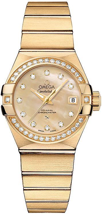 Model: 123.55.27.20.57.002 - CASE = [Material:18kt Yellow Gold], [Case Diameter:27], [Case Thickness:9mm], [Bezel:Fixed with Diamonds], [Case Back:Skeleton], [Water Resistant:100 Meters - 330 Feet], [Crystal:Scratch Resistant Sapphire], DIAL = [Color:Champagne Mother of Pearl with Diamonds], MOVEMENT = [Type:Automatic Chronometer], [Crown:Push In], BAND = [Clasp:Folding], [Type:18kt Yellow Gold], (Usually ships in 2 to 4 weeks.)