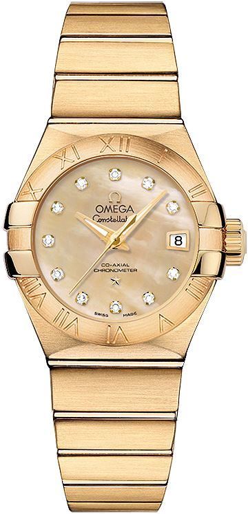 Model: 123.50.27.20.57.002 - CASE = [Material:18kt Yellow Gold], [Case Diameter:27], [Case Thickness:9mm], [Bezel:Fixed], [Case Back:Skeleton], [Water Resistant:100 Meters - 330 Feet], [Crystal:Scratch Resistant Sapphire], DIAL = [Color:Champagne Mother of Pearl with Diamonds], MOVEMENT = [Type:Automatic Chronometer], [Crown:Push In], BAND = [Clasp:Folding], [Type:18kt Yellow Gold], (Usually ships in 2 to 4 weeks.)