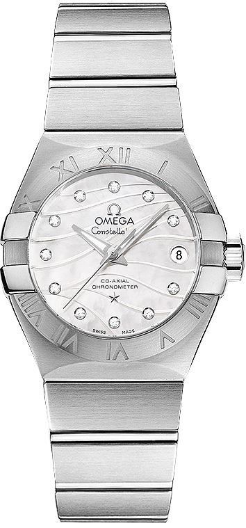 Model: 123.10.27.20.55.002 - CASE = [Material:Stainless Steel], [Case Diameter:27], [Case Thickness:9mm], [Bezel:Fixed], [Case Back:Skeleton], [Water Resistant:100 Meters - 330 Feet], [Crystal:Scratch Resistant Sapphire], DIAL = [Color:Mother of Pearl with Wavy Pattern and Diamonds], MOVEMENT = [Type:Automatic Chronometer], [Crown:Push In], BAND = [Clasp:Folding], [Type:Stainless Steel], (Usually ships in 2 to 4 weeks.)