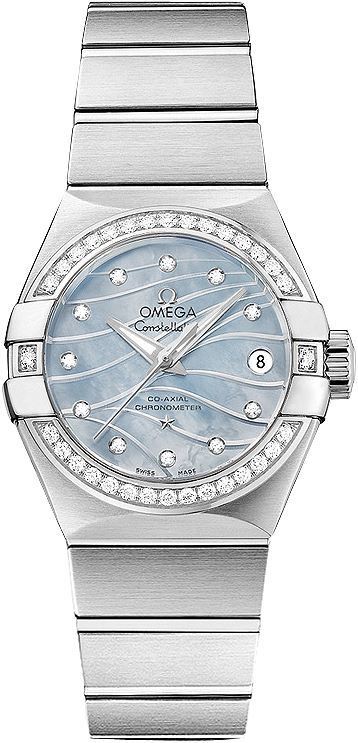 Model: 123.15.27.20.57.001 - CASE = [Material:Stainless Steel], [Case Diameter:27], [Case Thickness:9mm], [Bezel:Fixed], [Case Back:Skeleton], [Water Resistant:100 Meters - 330 Feet], [Crystal:Scratch Resistant Sapphire], DIAL = [Color:Blue Mother of Pearl with Wavy Pattern and Diamonds], MOVEMENT = [Type:Automatic Chronometer], [Crown:Push In], BAND = [Clasp:Folding], [Type:Stainless Steel], (Usually ships in 2 to 4 weeks.)