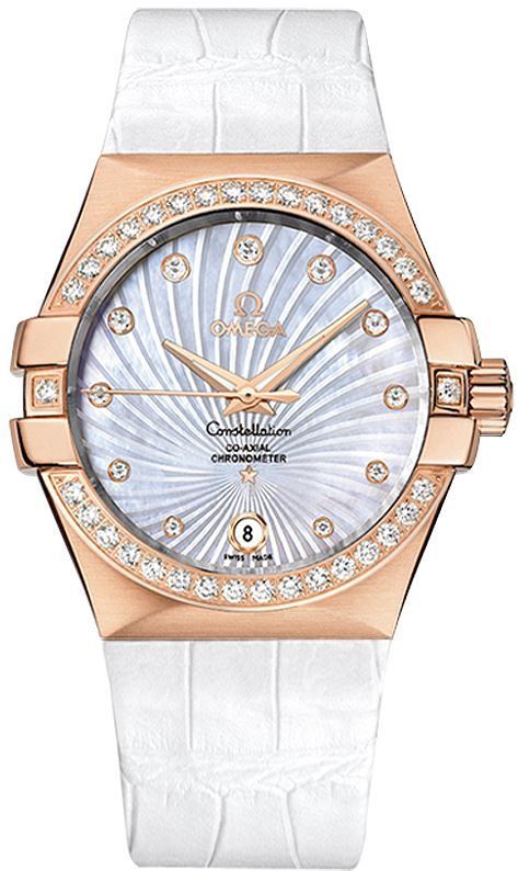 Model: 123.58.35.20.55.003 - CASE = [Material:18kt Rose Gold], [Case Diameter:35], [Bezel:Fixed with Diamonds], [Case Back:Skeleton], [Water Resistant:100 Meters - 330 Feet], [Crystal:Scratch Resistant Sapphire], DIAL = [Color:White Mother of Pearl with Supernova Pattern and Diamonds], MOVEMENT = [Type:Automatic Chronometer], [Crown:Push In], BAND = [Clasp:Deployment], [Type:White Alligator - Crocodile Leather], (Usually ships in 2 to 4 weeks.)