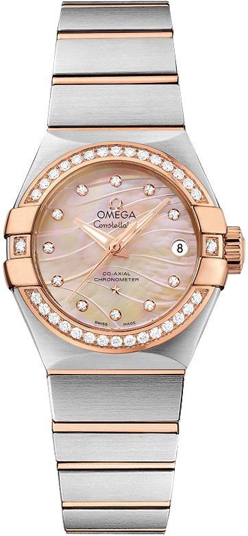 Model: 123.25.27.20.57.003 - CASE = [Material:Stainless Steel and Rose Gold], [Case Diameter:27], [Case Thickness:9mm], [Bezel:Fixed with Diamonds], [Case Back:Skeleton], [Water Resistant:100 Meters - 330 Feet], [Crystal:Scratch Resistant Sapphire], DIAL = [Color:Gold Mother of Pearl with Wavy Pattern and Diamonds], MOVEMENT = [Type:Automatic Chronometer], [Crown:Push In], BAND = [Clasp:Folding], [Type:Stainless Steel and Rose Gold], (Usually ships in 2 to 4 weeks.)