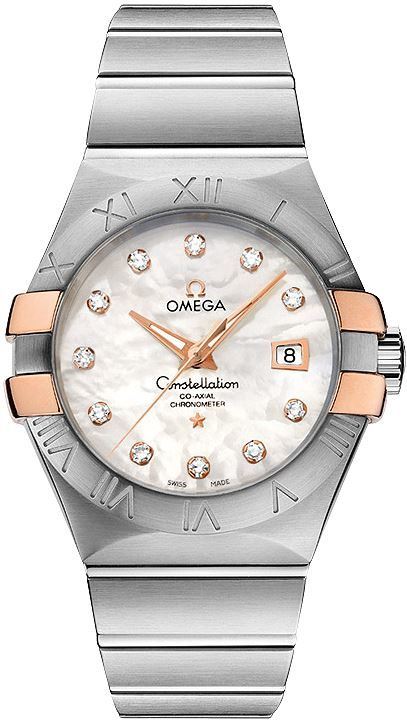 Model: 123.20.31.20.55.003 - CASE = [Material:Stainless Steel and Rose Gold], [Case Diameter:31], [Bezel:Fixed], [Case Back:Skeleton], [Water Resistant:100 Meters - 330 Feet], [Crystal:Scratch Resistant Sapphire], DIAL = [Color:White Mother of Pearl with Diamonds], MOVEMENT = [Type:Automatic Chronometer], [Crown:Push In], BAND = [Clasp:Folding], [Type:Stainless Steel], (Usually ships in 2 to 4 weeks.)