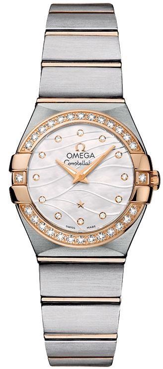 Model: 123.25.24.60.55.012 - CASE = [Material:Stainless Steel and Rose Gold], [Case Diameter:24], [Case Thickness:8.2mm], [Bezel:Fixed with Diamonds], [Case Back:Solid], [Water Resistant:100 Meters - 330 Feet], [Crystal:Scratch Resistant Sapphire],; DIAL = [Color:White Mother of Pearl with Wavy Pattern and Diamonds],; MOVEMENT = [Type:Quartz], [Crown:Push In],; BAND = [Clasp:Folding], [Type:Stainless Steel and Rose Gold], (Usually ships in 2 to 4 weeks.)