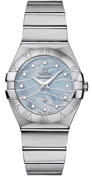 Model: 123.10.27.60.57.001 - CASE = [Material:Stainless Steel], [Case Diameter:27], [Case Thickness:9mm], [Bezel:Fixed], [Case Back:Solid], [Water Resistant:100 Meters - 330 Feet], [Crystal:Scratch Resistant Sapphire], DIAL = [Color:Blue Mother of Pearl with Wavy Pattern and Diamonds], MOVEMENT = [Type:Quartz], [Crown:Push In], BAND = [Clasp:Folding], [Type:Stainless Steel], (Usually ships in 2 to 4 weeks.)