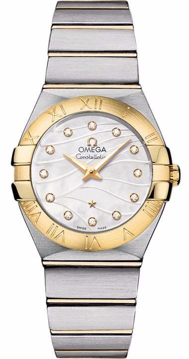 Model: 123.20.27.60.55.005 - CASE = [Material:Stainless Steel and Yellow Gold], [Case Diameter:27], [Case Thickness:9mm], [Bezel:Fixed], [Case Back:Solid], [Water Resistant:100 Meters - 330 Feet], [Crystal:Scratch Resistant Sapphire],; DIAL = [Color:White Mother of Pearl with Wavy Pattern and Diamonds],; MOVEMENT = [Type:Quartz], [Crown:Push In],; BAND = [Clasp:Folding], [Type:Stainless Steel and Yellow Gold], (Usually ships in 1 to 2 business days.)