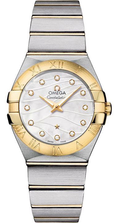 Model: 123.20.27.60.55.005 - CASE = [Material:Stainless Steel and Yellow Gold], [Case Diameter:27], [Case Thickness:9mm], [Bezel:Fixed], [Case Back:Solid], [Water Resistant:100 Meters - 330 Feet], [Crystal:Scratch Resistant Sapphire], DIAL = [Color:White Mother of Pearl with Wavy Pattern and Diamonds], MOVEMENT = [Type:Quartz], [Crown:Push In], BAND = [Clasp:Folding], [Type:Stainless Steel and Yellow Gold], (Usually ships in 1 to 2 business days.)