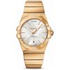 Model: 123.55.38.22.02.002 - CASE = [Material:18kt Yellow Gold, Brushed and Polished], [Case Diameter:38], [Bezel:Fixed 18k Yellow Gold, Roman Numerals Set with Diamonds], [Case Back:See-thru Sapphire crystal], [Water Resistant:100 Meters/330 Feet], [Crystal:Anti-Reflective Scratch Resistant Sapphire], DIAL = [Color:Silver with Index Hour Markers, Day at 12 and Date at 6], MOVEMENT = [Type:Co Axial Chronometer - Automatic Self Winding Omega 8612 with Approx. 55hr Power Reserve], BAND = [Clasp:Deployment Buckle], [Type:18kt Yellow Gold], (Usually ships in 2 to 4 weeks.)