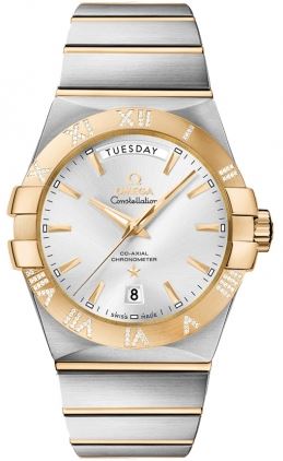 Model: 123.25.38.22.02.002 - CASE = [Material:Brushed Steel/18kt Yellow Gold], [Case Diameter:38], [Bezel:Fixed 18k Yellow Gold, Roman Numerals Set with Diamonds], [Case Back:See-thru Sapphire crystal], [Water Resistant:100 Meters/330 Feet], [Crystal:Anti-Reflective Scratch Resistant Sapphire], DIAL = [Color:Silver with Index Hour Markers, Day at 12 and Date at 6], MOVEMENT = [Type:Co Axial Chronometer - Automatic Self Winding Omega 8602 with Approx. 55hr Power Reserve], BAND = [Clasp:Deployment Buckle], [Type:Steel/18kt Yellow Gold], (Usually ships in 2 to 4 weeks.)