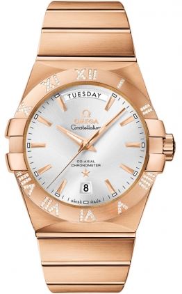 Model: 123.55.38.22.02.001 - CASE = [Material:18kt Rose Gold, Brushed and Polished], [Case Diameter:38], [Bezel:Fixed 18k Rose Gold, Roman Numerals Set with Diamonds], [Case Back:See-thru Sapphire crystal], [Water Resistant:100 Meters/330 Feet], [Crystal:Anti-Reflective Scratch Resistant Sapphire], DIAL = [Color:Silver with Index Hour Markers, Day at 12 and Date at 6], MOVEMENT = [Type:Co Axial Chronometer - Automatic Self Winding Omega 8612 with Approx. 55hr Power Reserve], BAND = [Clasp:Deployment Buckle], [Type:18kt Rose Gold], (Usually ships in 2 to 4 weeks.)